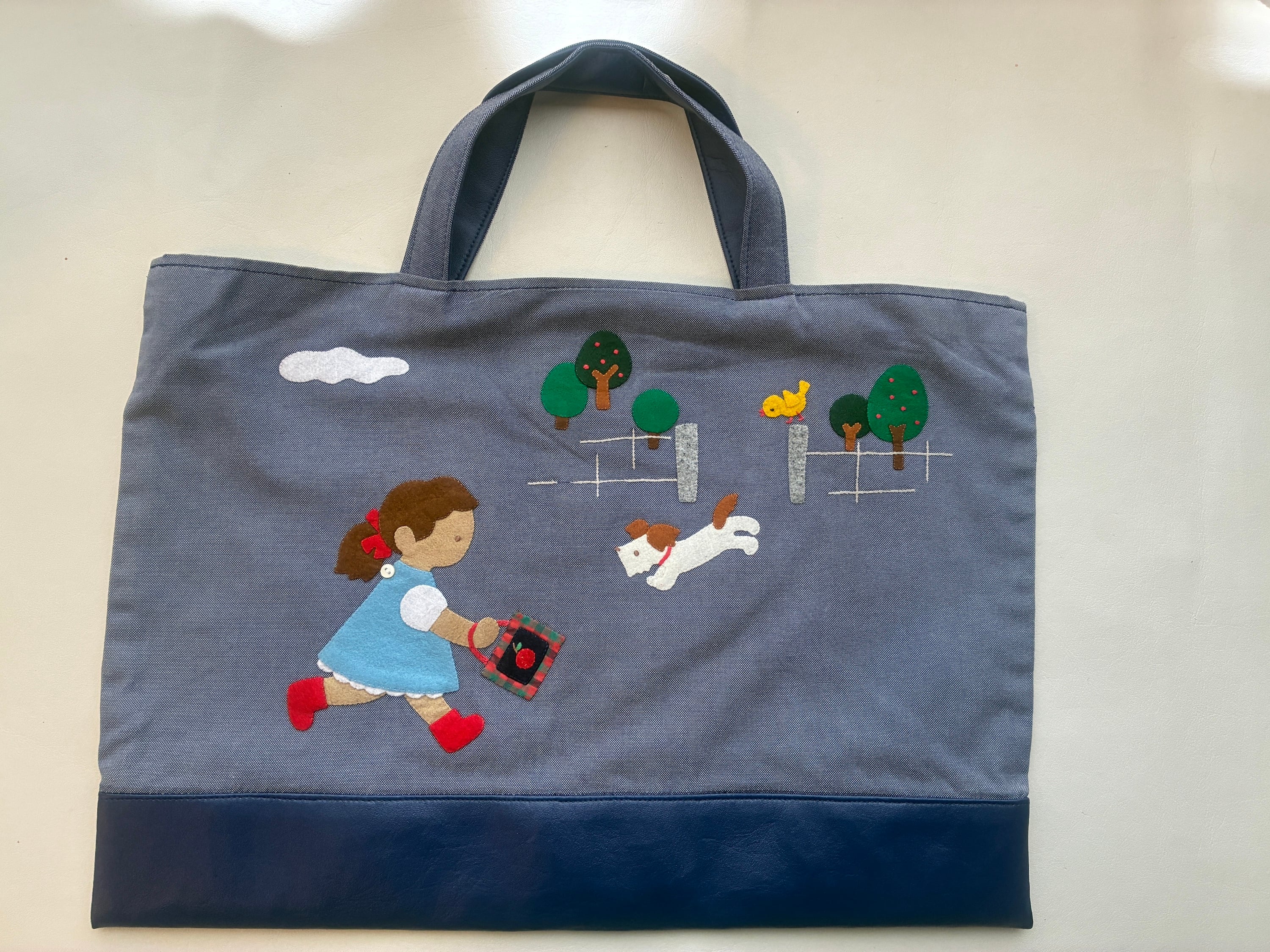 ファミリア デニムバッグ ヴィンテージ 女の子&子犬 小学校 【持ち手・合皮リメイク済み】